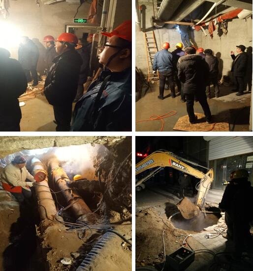 1月16日晚上九點多,站員在巡站過程中發(fā)現(xiàn)東亞二北墻外人行道路面有滲水的情況,并且還有熱氣,確定是公司管線,于是打電話上報公司調(diào)度。調(diào)度接到匯報之后立即通知各部門,胡總帶領(lǐng)安全設(shè)備部、生產(chǎn)部及檢修部門緊急趕到現(xiàn)場確認情況,由于漏點不大,且無法調(diào)配挖機。于是立即做立警戒錐、上圍擋等安全防護施,以防止意外情況的發(fā)生,并于次日清晨開始挖掘確認漏點位置。此管線為DN500管線,漏點在管道側(cè)方,漏點處無保溫。由于兩頭閥門無法關(guān)嚴,只能在漏點位置泄水,待壓力減小才能作業(yè)。此次搶修由施工方負責(zé),公司檢修及各部門人員積極配合工作,本次搶修任務(wù)在半夜三點順利完成。