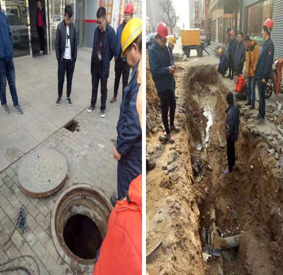本月下旬,站長在樂園周邊查失水時發(fā)現(xiàn)東邊底店邊一熱力井內(nèi)有大量積水,懷疑此處出現(xiàn)漏點。于是叫檢修前來檢查,檢修在抽完井內(nèi)水之后未在井內(nèi)發(fā)現(xiàn)漏點,于是在滲水路面用小型機械開始挖掘。在順著熱力井向南二次網(wǎng)主管方向挖掘后,發(fā)現(xiàn)主管處并無漏點,有一根電纜管有個洞向外漏水。與此同時,熱力井旁邊一米處底店門口,突然出現(xiàn)路面坍塌現(xiàn)象。經(jīng)觀察是從底店方向出來的水將地下土灌塌導致部分路面下陷,可以確定漏點是在熱力井到底店方向。基本確定漏點后,對此處漏點進行搶修。