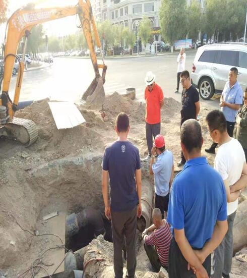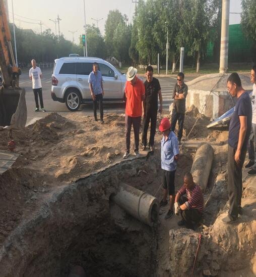 7月22日,公司拿到施工確認(rèn)通知單后,檢修部門按公司要求開始對幸福南路與召園路交叉口一次網(wǎng)漏點(diǎn)處進(jìn)行搶修作業(yè)。漏點(diǎn)位于十字路口東南角處的下水井旁邊,在馬路正下方。在機(jī)械破路之后才能開始人工挖掘,工程量相對較大。尤其是管路周邊的不確定性更是給本次作業(yè)增加了相當(dāng)大的作業(yè)難度。破路之后才發(fā)現(xiàn)天然氣管道和電力一根電纜鋪設(shè)在距離我方管線非常近的位置。在這種情況下,施工過程中發(fā)生了一次意外事件,不過好在現(xiàn)場人員應(yīng)對及時,才避免了事態(tài)的進(jìn)一步擴(kuò)大。之后在無機(jī)械設(shè)備的輔助狀態(tài)下,檢修部門全靠人力進(jìn)行管道挖掘。常務(wù)副總劉總?cè)淘诂F(xiàn)場指導(dǎo)工作。