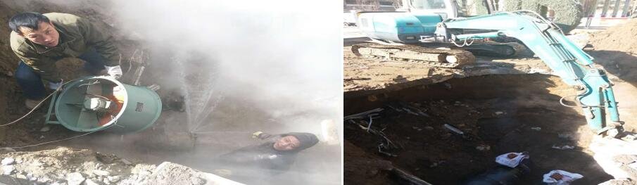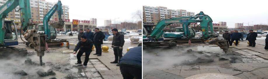 2月7日,正值包頭市入冬以來第一場大雪。恒大熱力站報(bào)告小區(qū)門口主干線井內(nèi)有熱氣冒出、路面有水跑冒,懷疑我公司供熱管線有漏點(diǎn)。接到報(bào)告后搶修小組立即驅(qū)車趕赴現(xiàn)場。搶修組長安迎春通過查看主干線井內(nèi)情況排除是井內(nèi)漏水,但是路面跑漏的水與冷空氣交匯產(chǎn)生巨大蒸汽證明確實(shí)是有溫度的。隨后技術(shù)部達(dá)到現(xiàn)場告知,跑水下方埋預(yù)留恒大抽頭盲板,懷疑抽頭盲板處跑水,挖機(jī)開始挖掘。