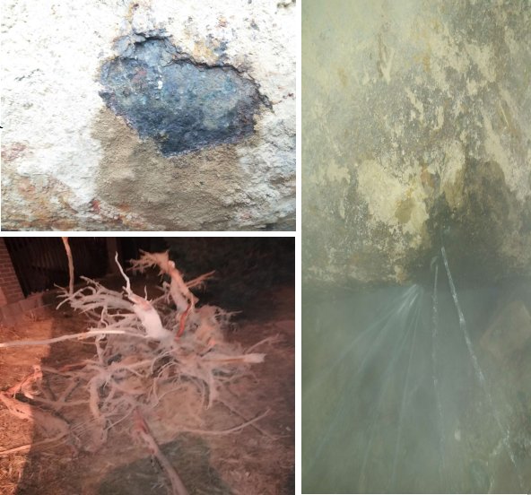 泄漏原因:前幾年開發(fā)區(qū)綠化栽樹時種的大樹全部栽種在我公司供熱管道上。事故漏點由于栽樹時保溫皮被破壞腐蝕嚴重。裸管上部的大樹由于高溫死掉只留下樹根。我公司管道沒有保溫層腐蝕非常嚴重,未發(fā)生漏點的回水管(上圖)也將馬上破裂。此情況已上報燃氣熱力處。